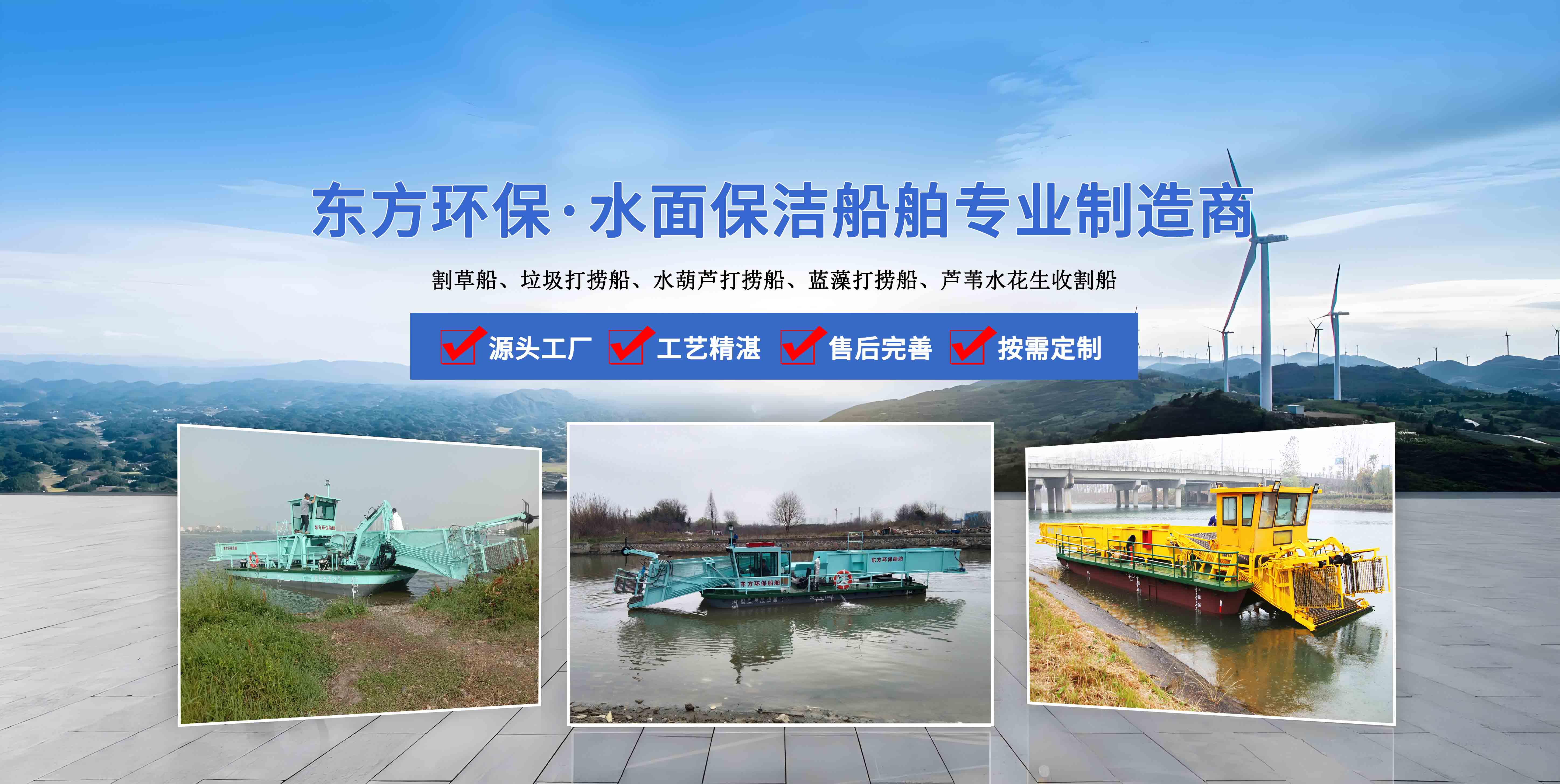 東方船舶是集研發(fā)、生產(chǎn)、服務(wù)為一體的現(xiàn)代化企業(yè),產(chǎn)品十幾種系列 主營(yíng)業(yè)務(wù):清潔船、水草收割船、垃圾打撈船、水面保潔船等